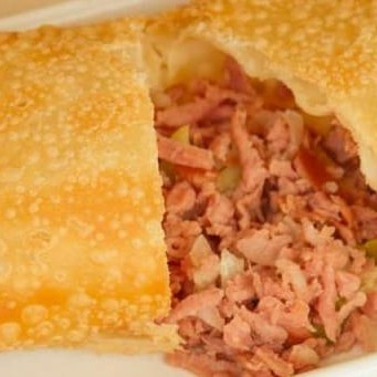 Pastel crocante recheado com presunto, queijo e orégano