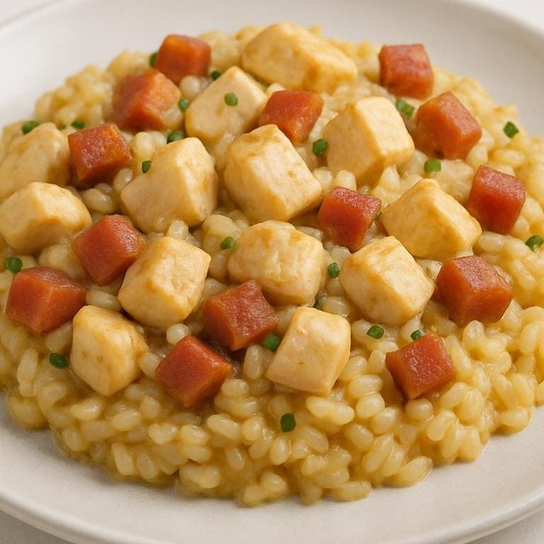 Risoto de calabresa em cubos, Catupiry 4q e parmesão, finalizado com manteiga e mais parmesão.