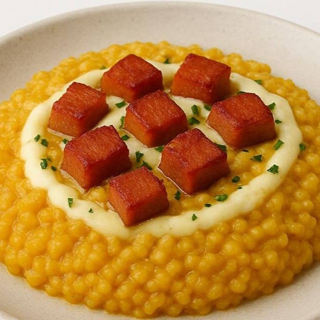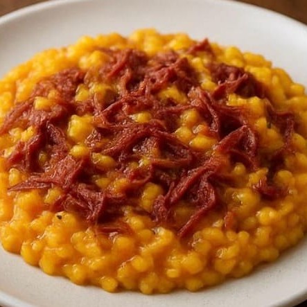 Risoto de carne seca desfiada com purê de abóbora e parmesão, finalizado com manteiga e mais parmesão.