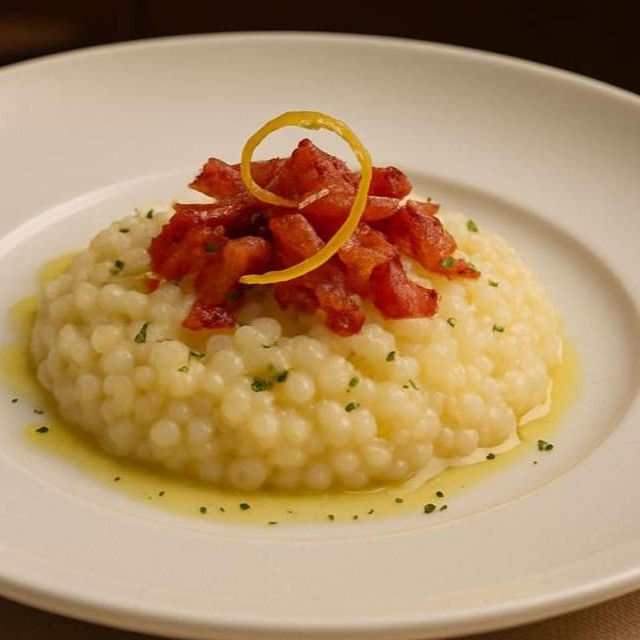 Risotto arbório bacon em cubos e suco de limão siciliano, finalizado com parmesão.