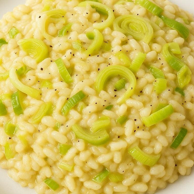 Um risoto cremoso feito com arroz arbóreo, alho-poró fresco, parmesão ralado.