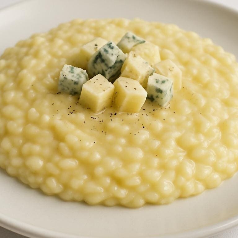 Risotto com queijo parmesão, queijo gorgonzola e requeijão cremoso. Finalizado com manteiga e mais parmesão.