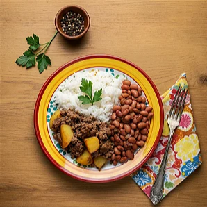 Carne moída suculenta com batata, servida com arroz branco soltinho e feijão