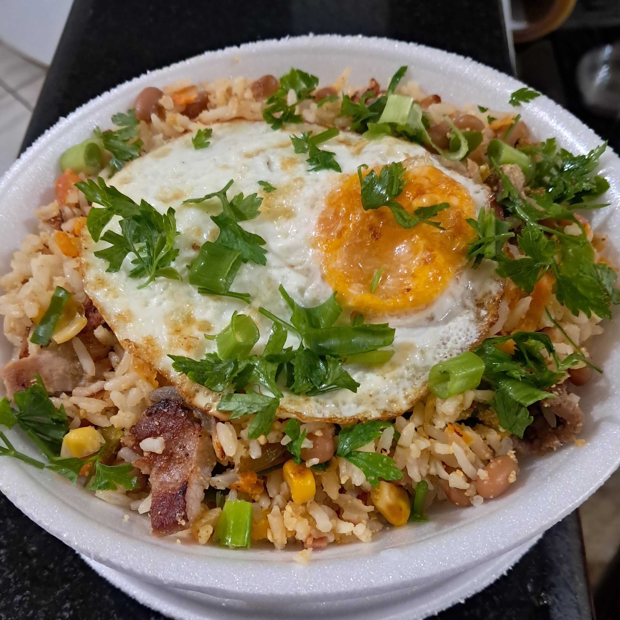 Arroz, feijão, bacon, calabresa, ovo frito, tomate, pimentão, cebola, cenoura, milho, cheiro verde
