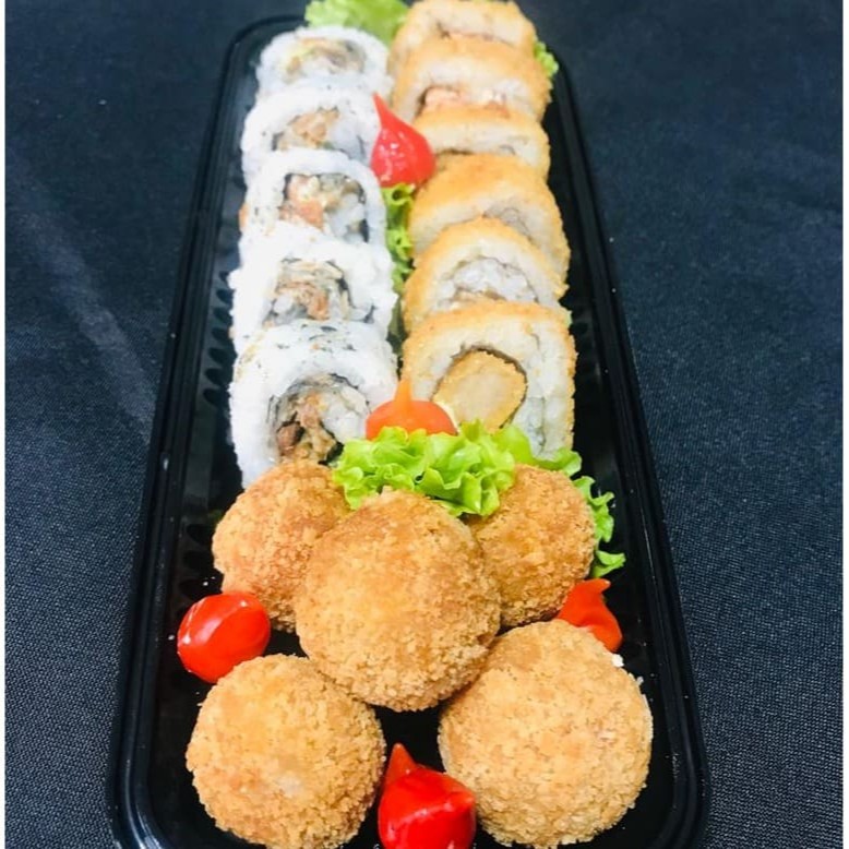 5 Sashimi Salmão 10g 3 Niguiri Skin 3 Niguiri Salmão 3 Niguiri Kani 5 Maki Filadelfia 5 Maki California 5 Maki Skin 5 Maki Geleia 5 Uramaki Skin Cheese 5 Fisha Ball 6 Hot Chicken