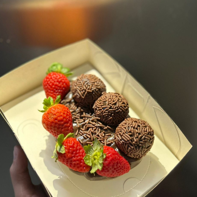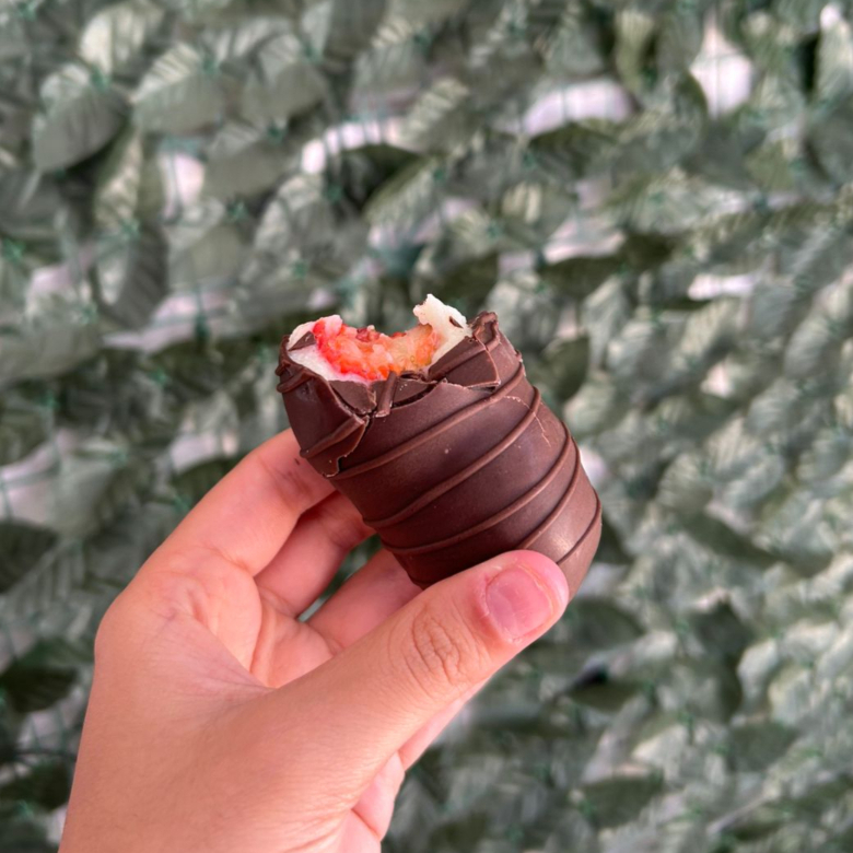 Brigadeiro 50% cacau modelado no formato de coxinha, com morango fresquinho no centro e finalização no granulado tradicional. Cremoso por fora, suculento por dentro — a combinação perfeita pra quem ama um docinho diferenciado!