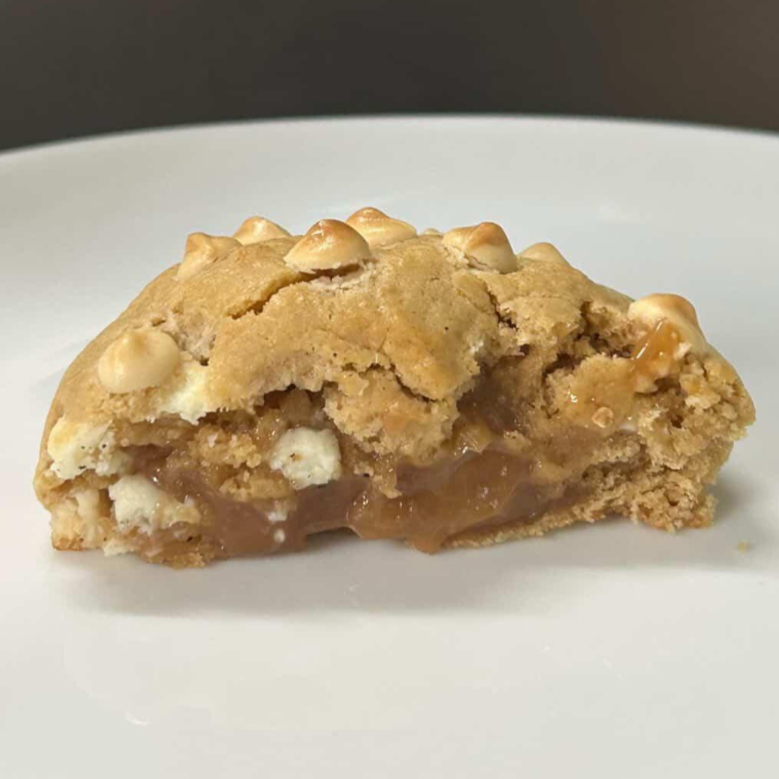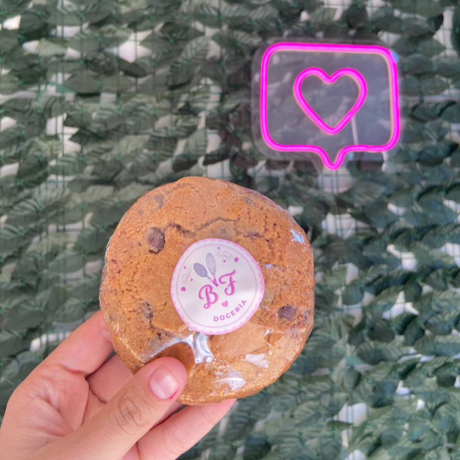 Cookie com gotas de chocolate branco e recheio de doce de leite