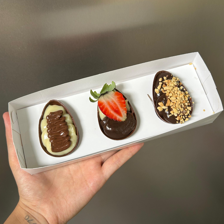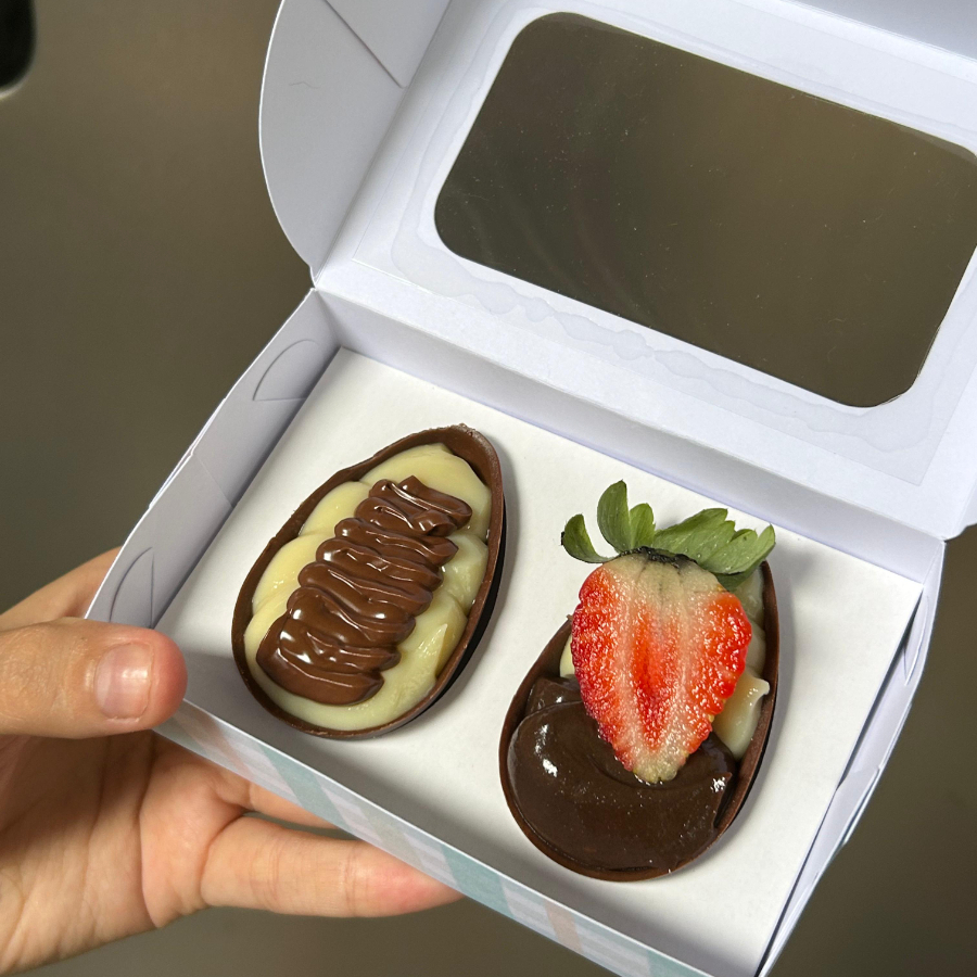 Dois mini ovos irresistíveis: Ninho com Nutella, super cremoso, e 2 Amores, com brigadeiro 50% cacau, ninho e morango. Uma combinação perfeita para quem ama sabores clássicos e bem recheados.