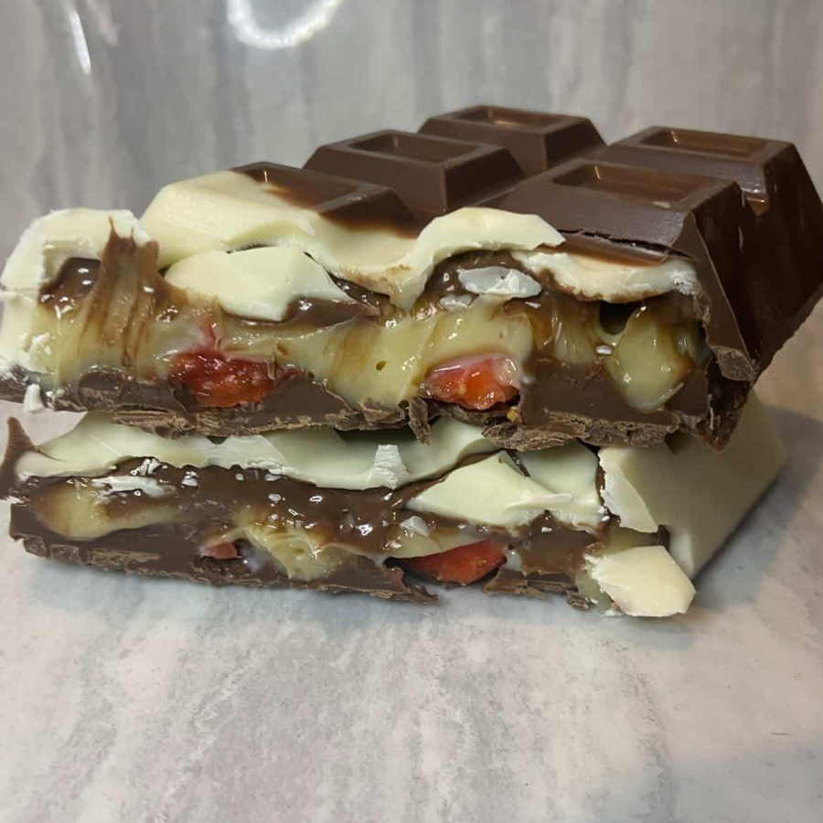 O bombom de morango com Ninho possui uma camada de chocolate recheada com brigadeiro de leite Ninho e morangos, oferecendo uma combinação cremosa, doce e refrescante