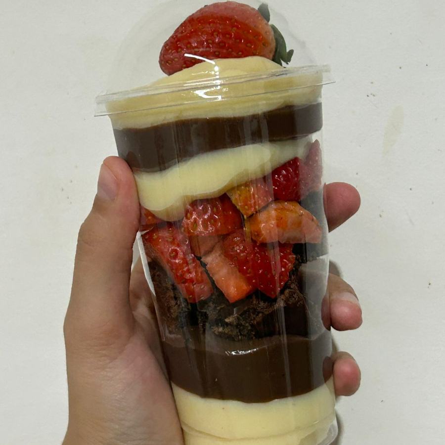 Camadas de brigadeiro de Ninho, no meio pedaços de morangos frescos, brigadeiro de chocolate por cima finalizando com um morango..