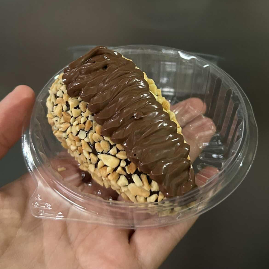 Coxinha de morango recheada com Nutella, coberta com amendoim crocante e finalizada com mais Nutella por cima, inspirada no sabor do Ferrero Rocher. Uma combinação irresistível de morango, chocolate e crocância! 🍓🍫✨