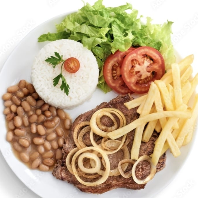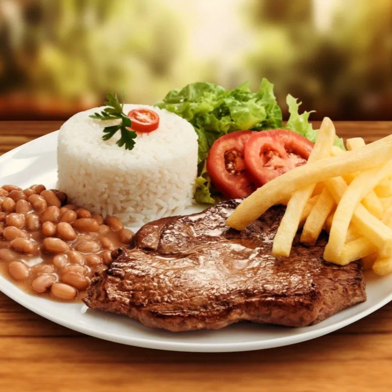 Arroz, Feijão, Fritas, Farofa, Bife de Boi e salada