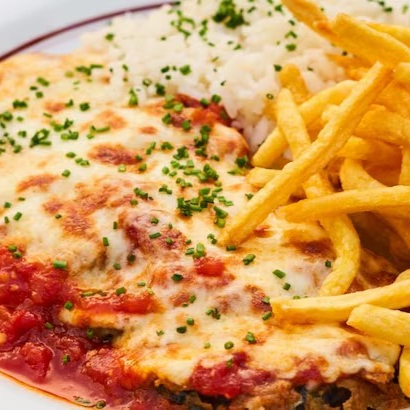Bife À Parmegiana - Arroz, Batata Frita, Queijo E Molho De Tomate