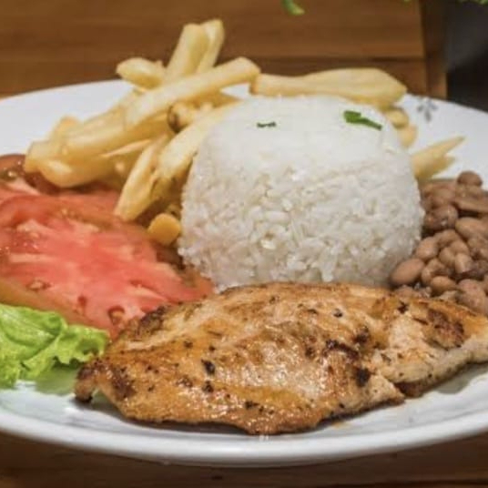Arroz, Feijão, Fritas, Farofa, Bife de Frango e salada