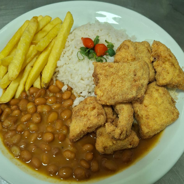 Arroz, Feijão, Fritas, Farofa, Tilapia empanada e salada