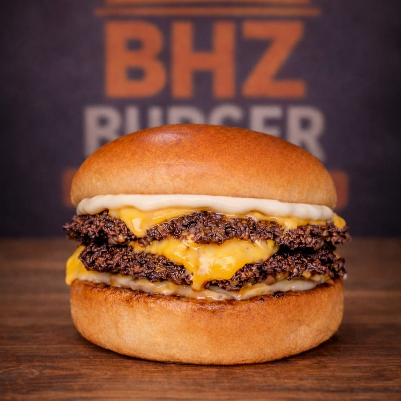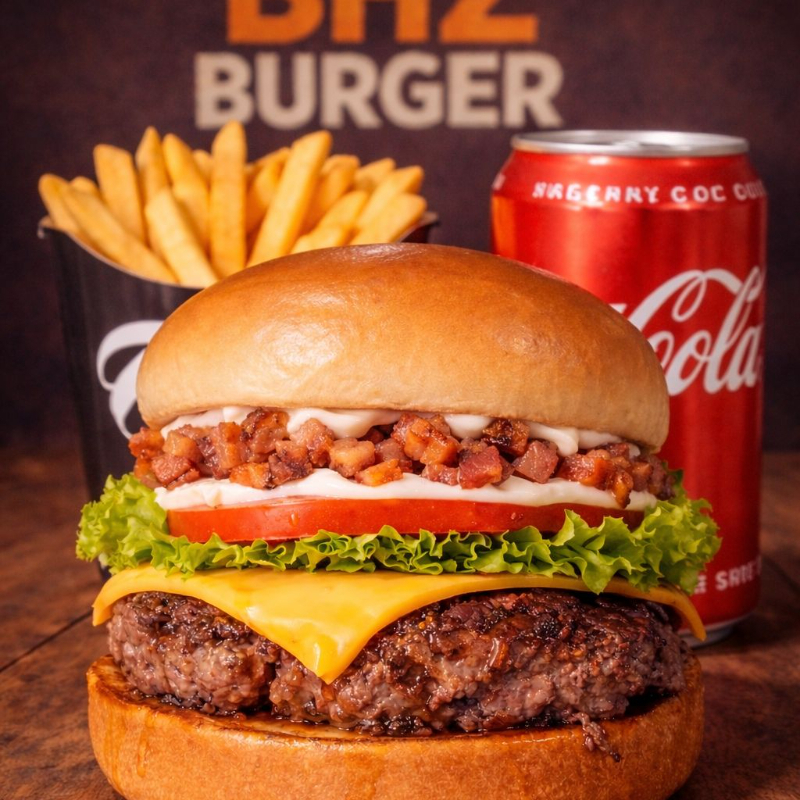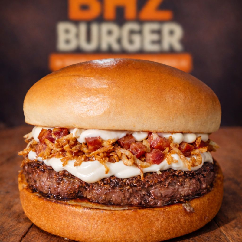 Pão de Brioche Especial, Suculento Burger de 130g, Requeijão Cremoso, Bacon Crocante, Cebola Crispy e Maionese Especial.