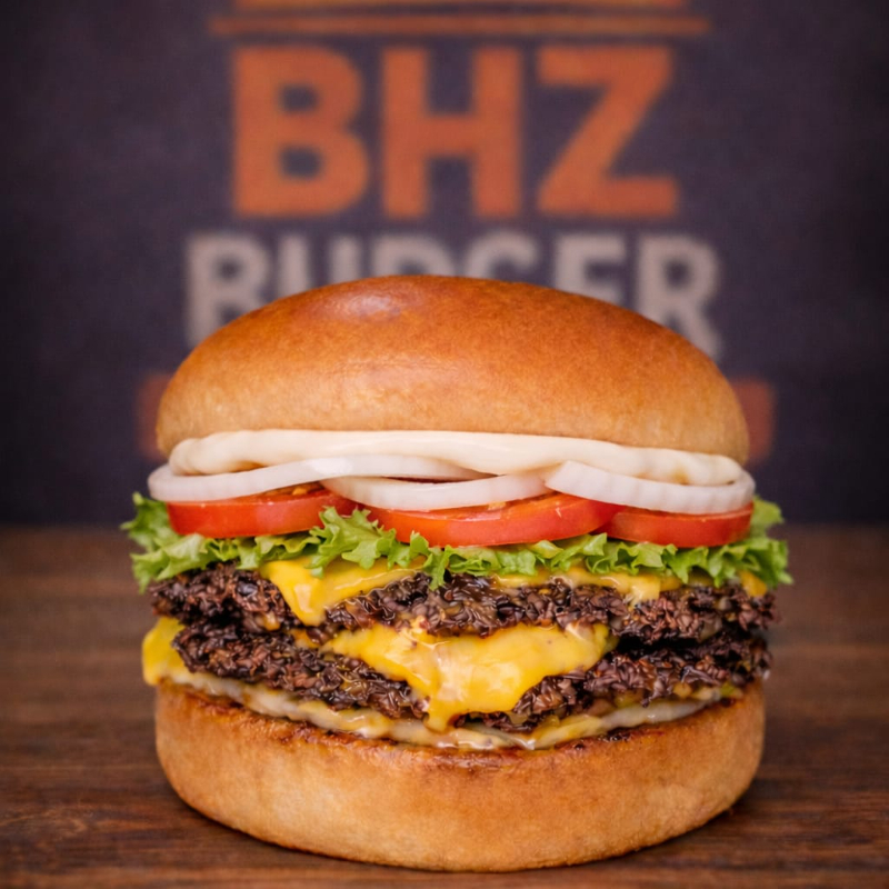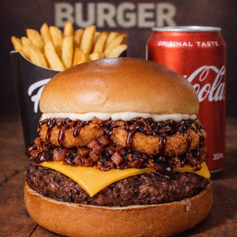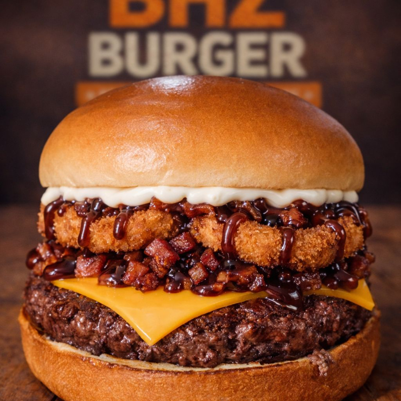 Pão de Brioche Especial, Suculento Burger de 130gr, Queijo Cheddar Fatia, Bacon Crocante, 2 Anéis de Cebola, Barbecue e Maionese Especial da Casa.