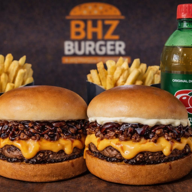 Escolha Dois Burgers Premium do Nosso Cardápio Entre os Mais Vendidos da Casa, Acompanhados de Duas Batatas Fritas e um Refrigerante de 600ml.