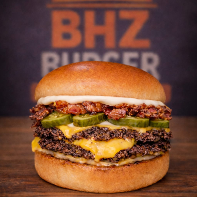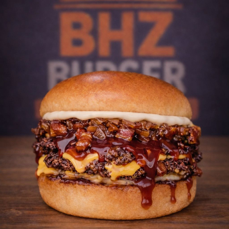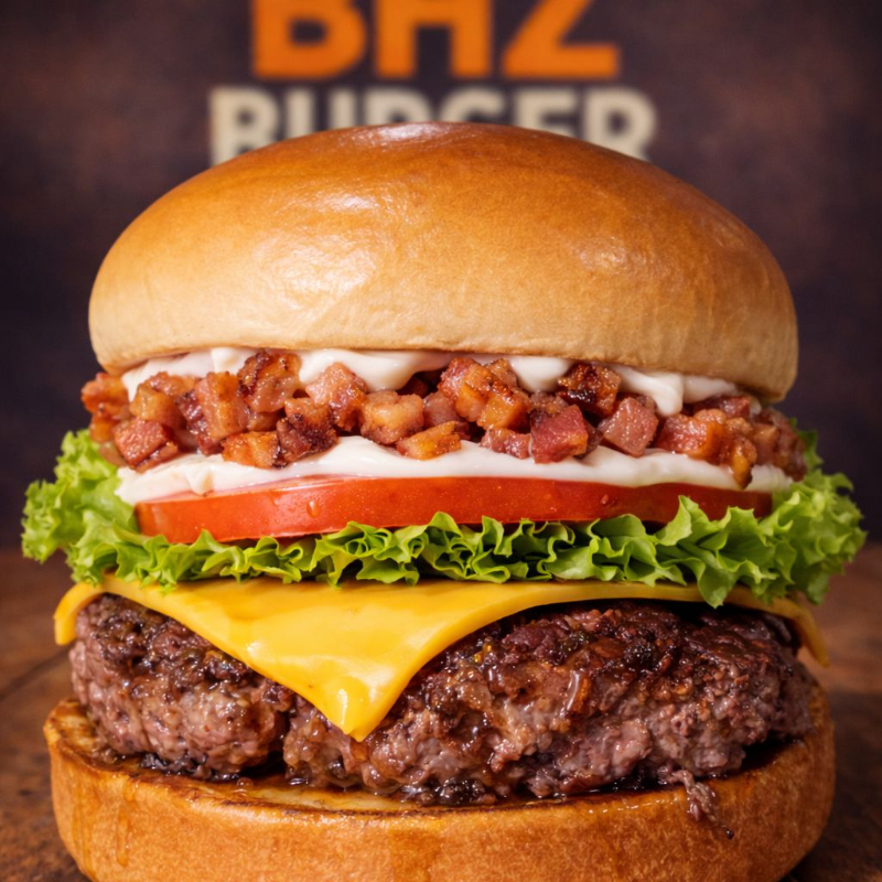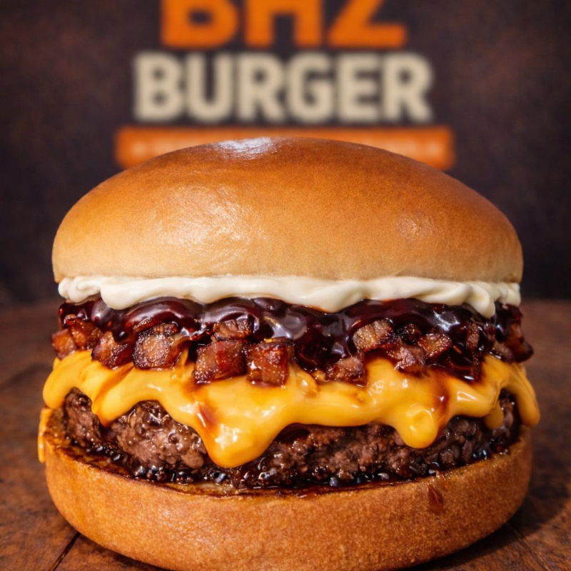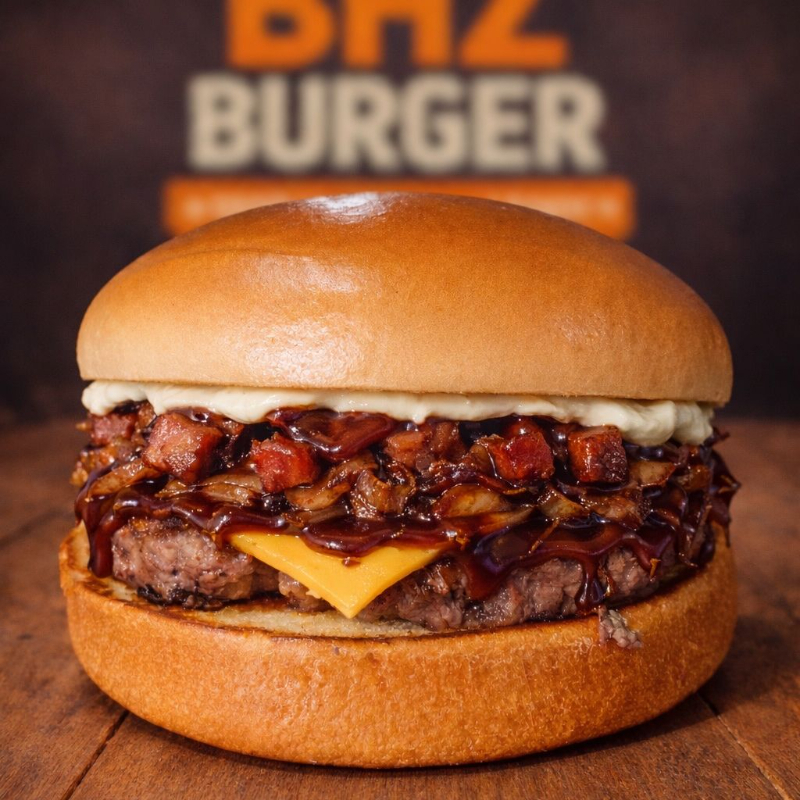 Pão de Brioche Especial, Suculenta Carne de 130g, Bacon Crocante, Queijo Cheddar Fatia, Cebola Caramelizada Levemente Adocicada, Molho Barbecue e Maionese Especial da Casa.