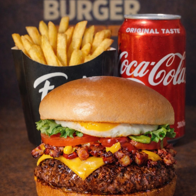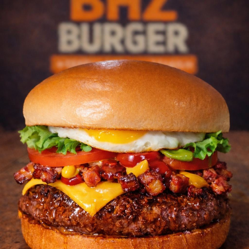 Pão de Brioche Especial, Suculento Burger de 130g, Ovo Frito, Queijo Cheddar Fatia, Bacon Crocante, Tomate, Alface Americana, Mostarda Dijon e Ketchup Heinz