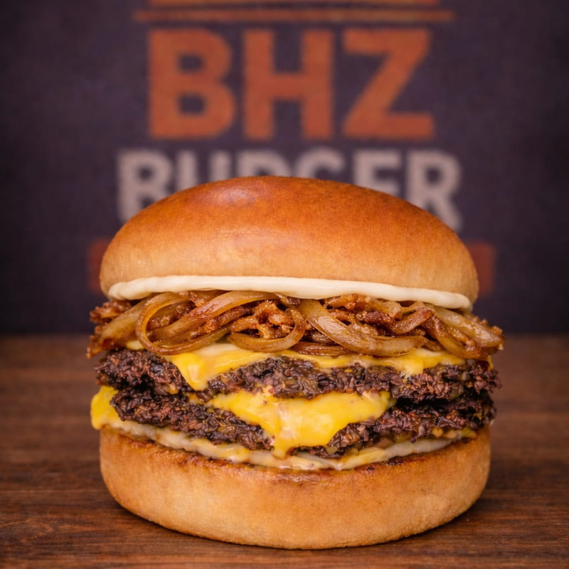 Pão de Brioche Especial, Duas Carnes 65gr Cada, Cheddar Fatia, Bacon Crocante, Cebola Caramelizada, Maionese Artesanal e Molho Barbecue