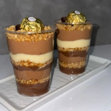 No copo acompanha, recheio de brigadeiro gourmet, delicioso mousse avelã , castanhas , recheio de ninho e bombom Ferrero Rocher .