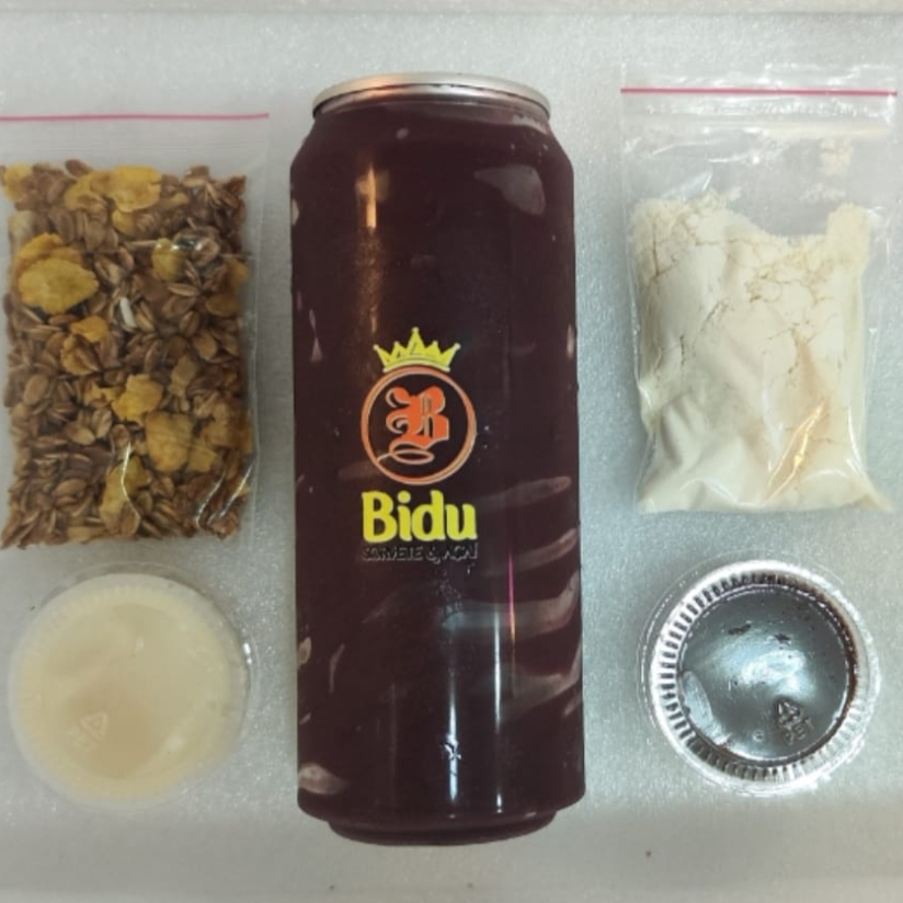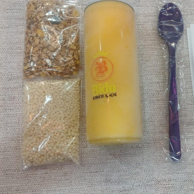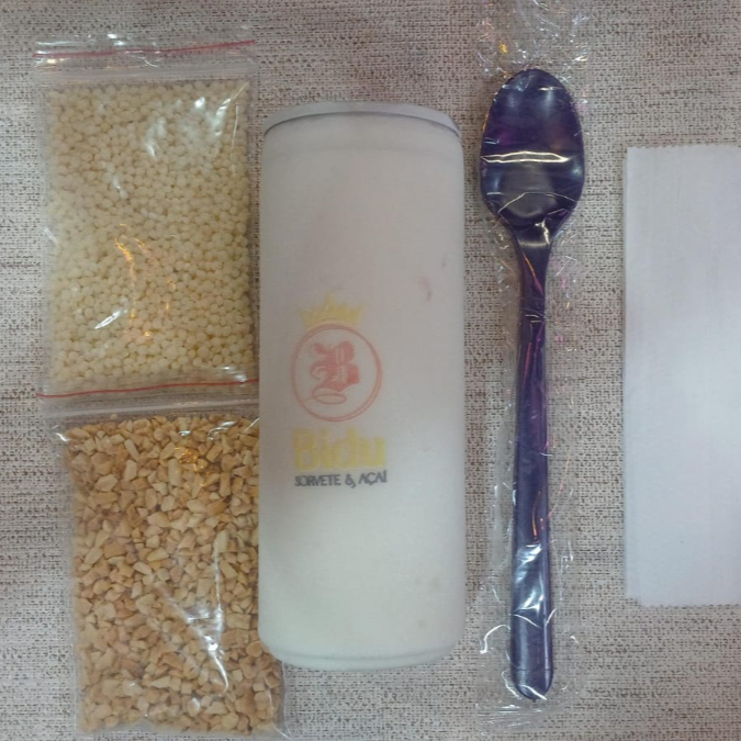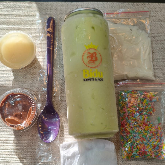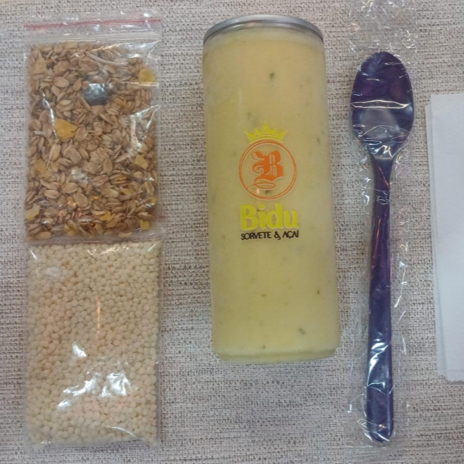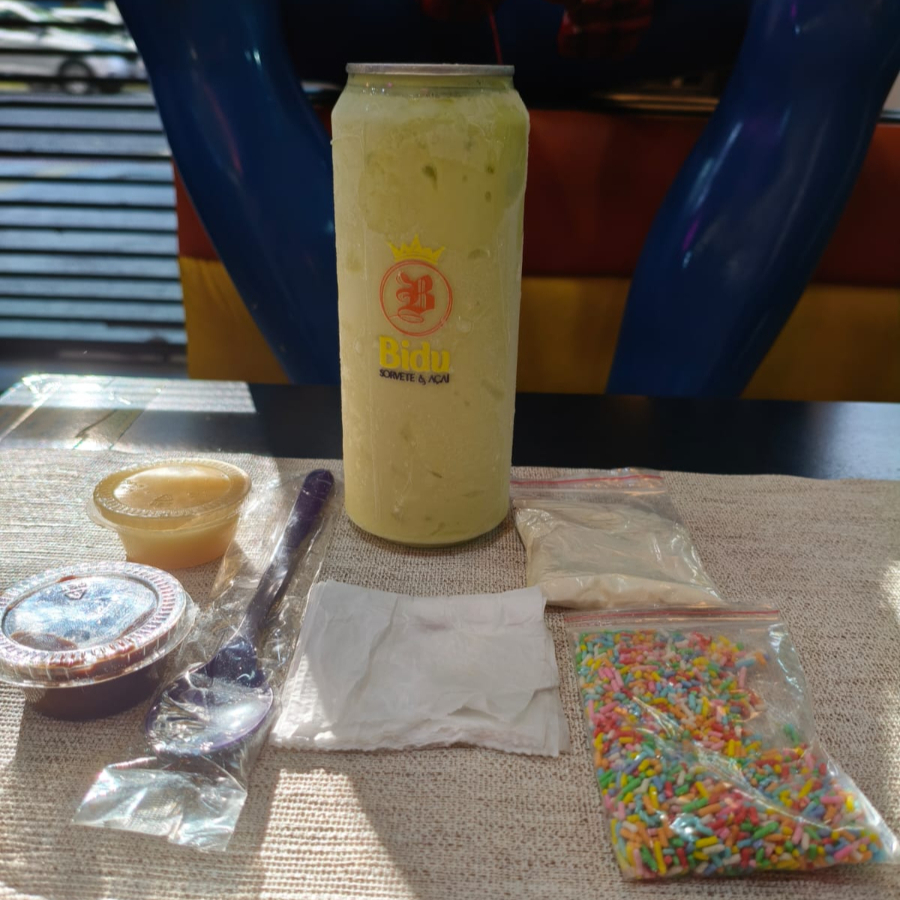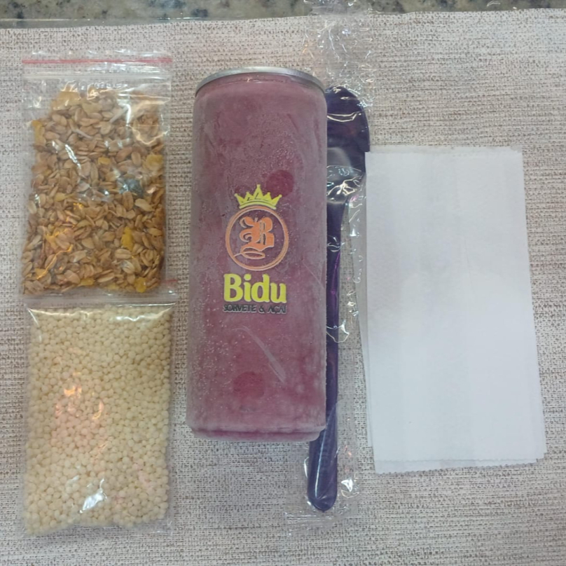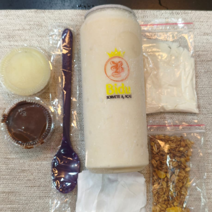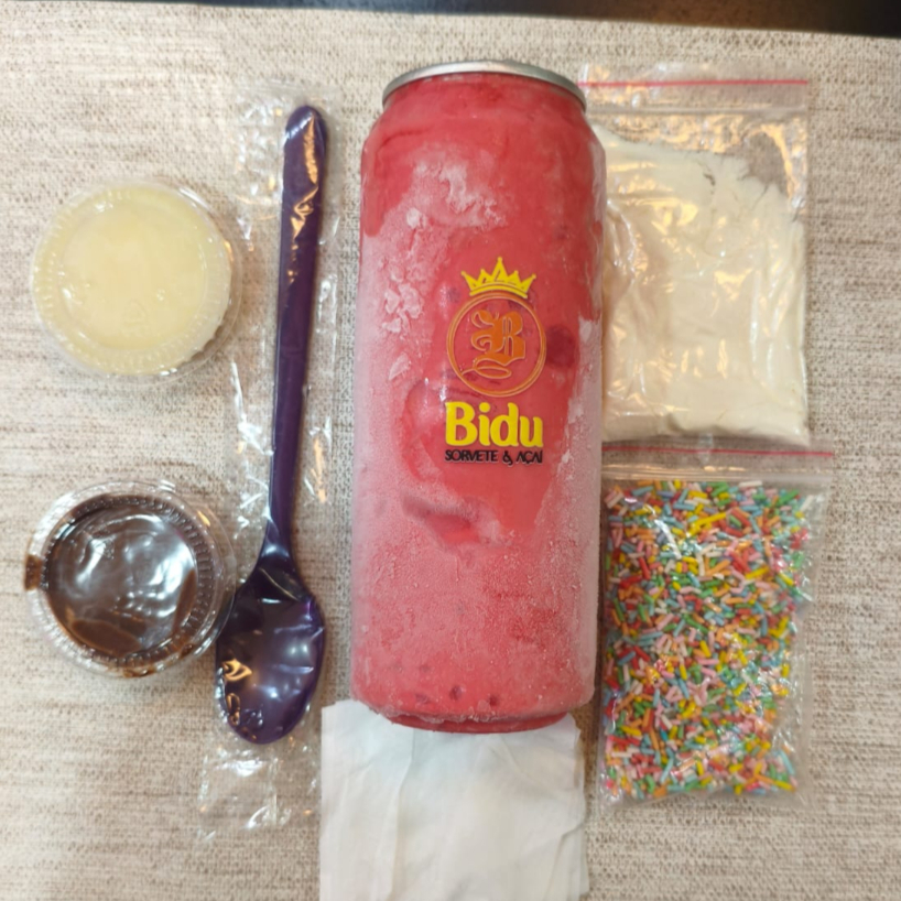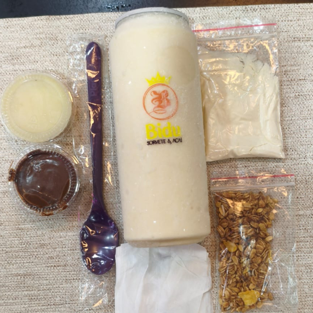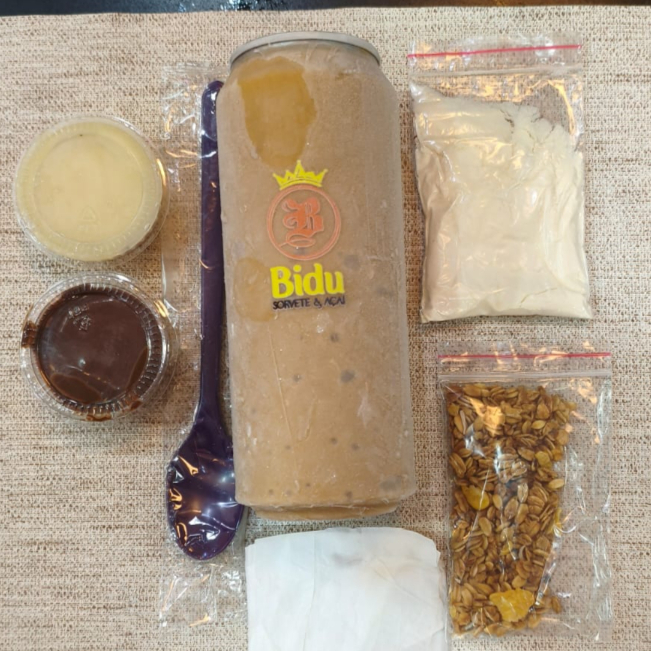 AÇAÍ DE 500 ML com sorvete de ninho . NA LATA COM 4 ACOMPANHAMENTOS GRANOLA,LEITE EM PÓ, CREME DE AVELÃ E LEITE CONDENSADO