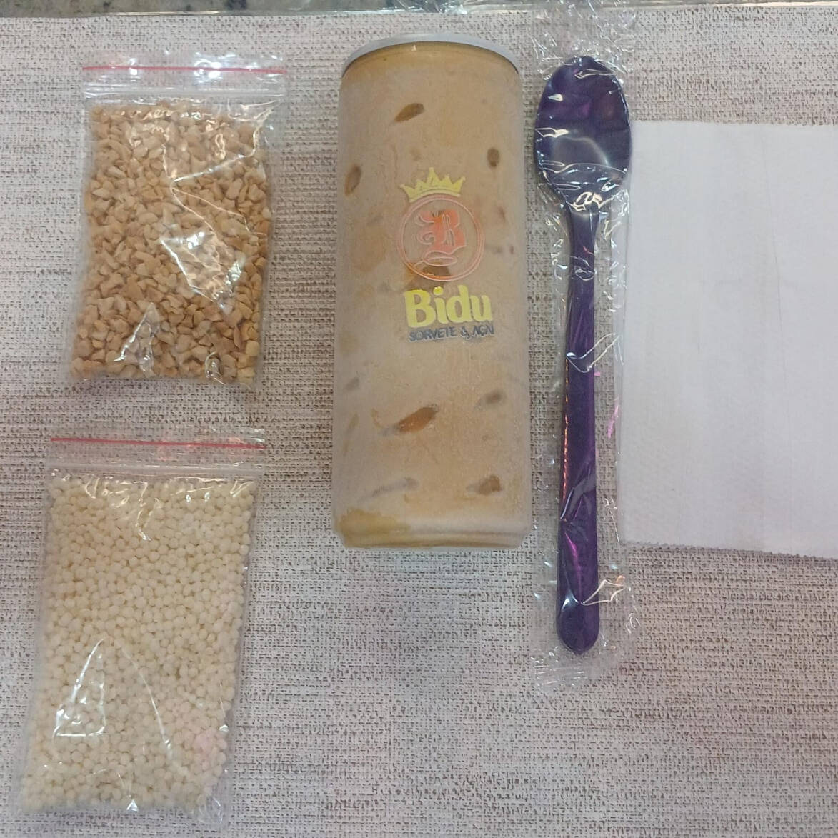 SORVETE COM 4 ACOMPANHAMENTOS LEITE EM PO , GRANULADO,CREME DE AVELÃ E LEITE CONDENSADO