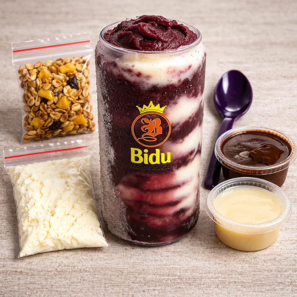 AÇAÍ DE 500 ML NA LATA COM 4 ACOMPANHAMENTOS GRANOLA,LEITE EM PÓ, CREME DE AVELÃ E LEITE CONDENSADO