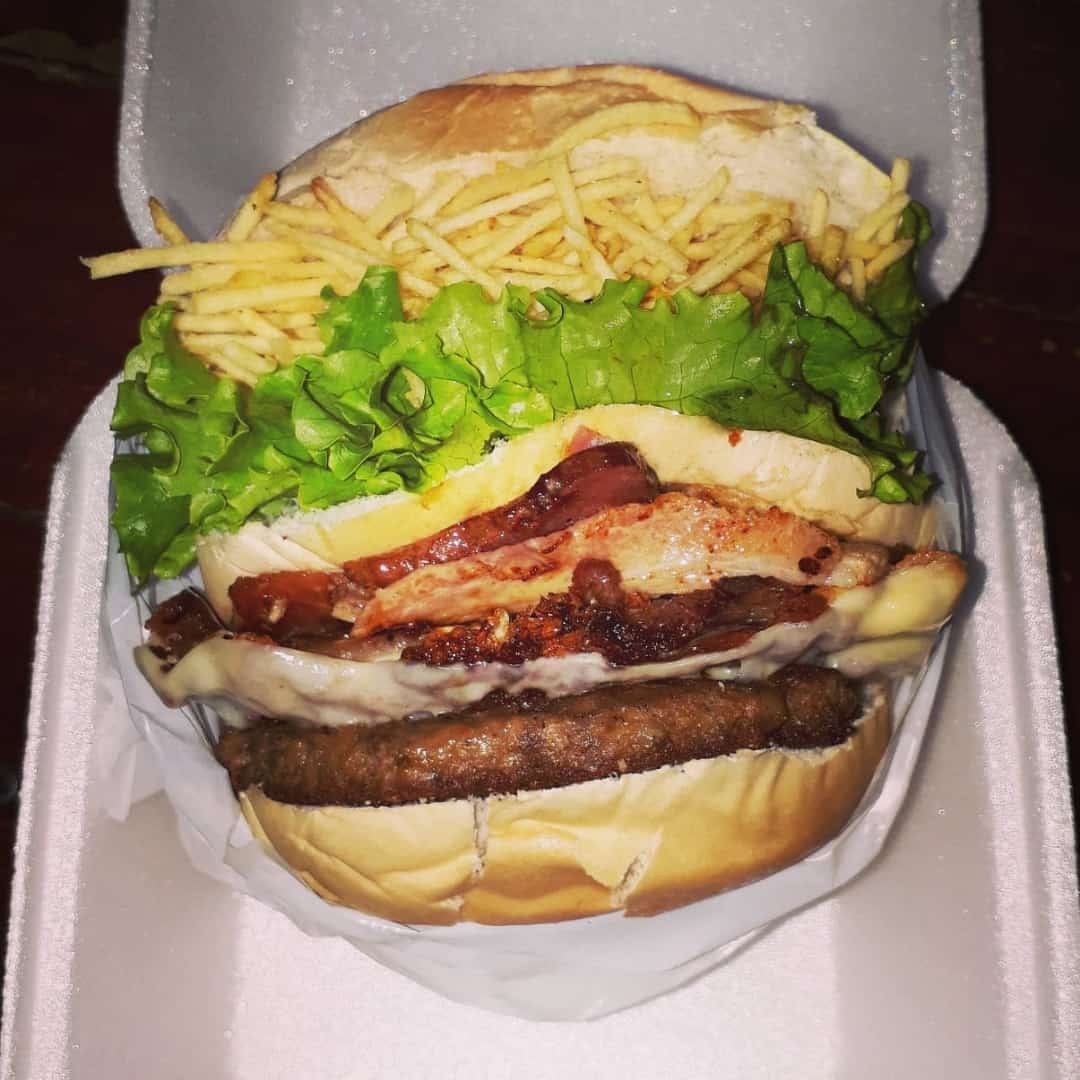 Pão, carne de hambúrguer, bacon, muçarela, creme de maionese, milho, alface, tomate e batata palha