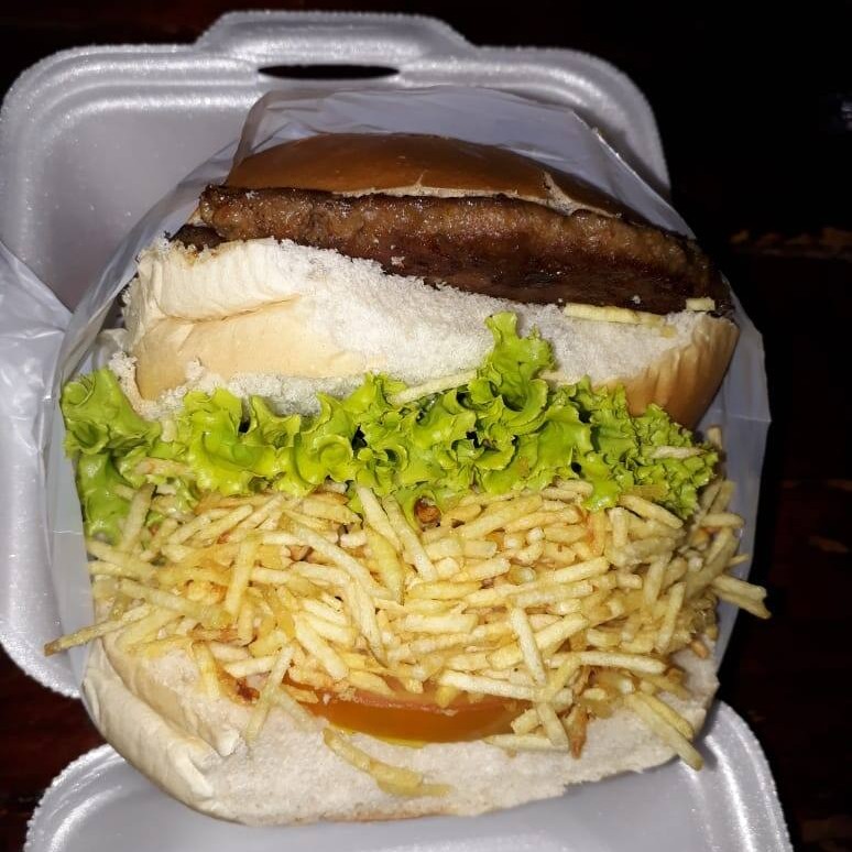 Pão, carne de hambúrguer, creme de maionese, alface, tomate e batata palha