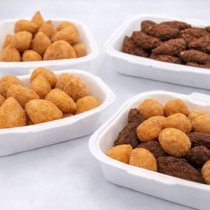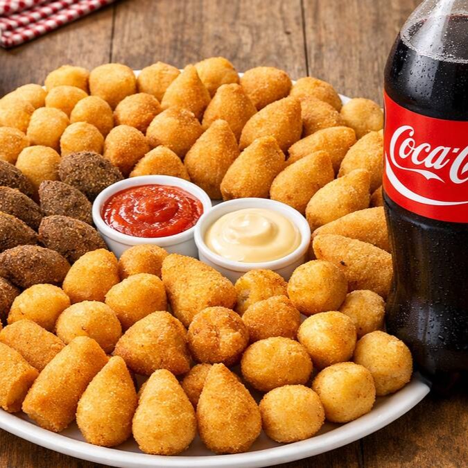 Uma seleção irresistível de salgados fritos na hora, crocantes por fora e macios por dentro! Contém: coxinha de frango, kibe crocante, pastelzinho de milho com queijo, bolinha de cheddar, pastelzinho de presunto e pastelzinho de alho poró.