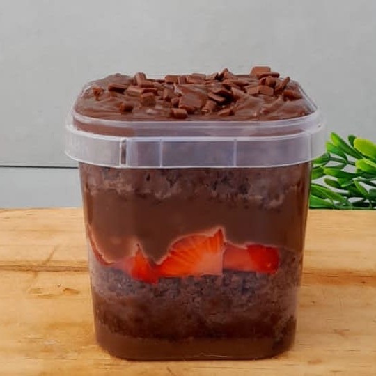 "Delicie-se com nosso bolo no pote. Irresistível combinação de massa de chocolate com recheio de brigadeiro e morangos frescos. Uma explosão de sabores a cada colherada."""