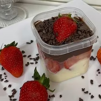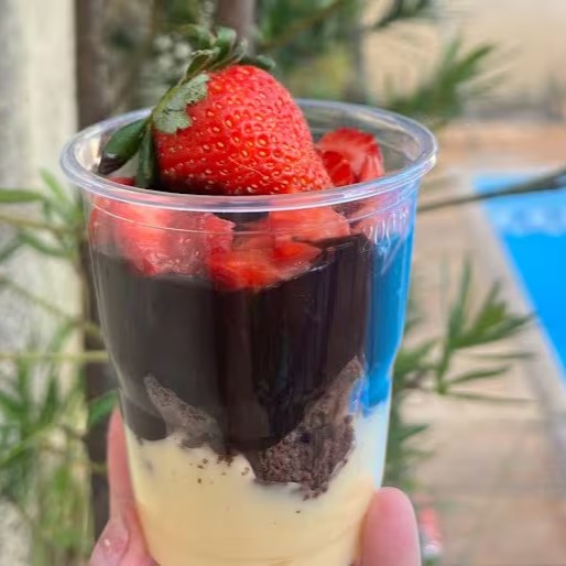 Copo da Felicidade Brownie com Morangos Selecionados Uma explosão de sabor em camadas irresistíveis: brownie artesanal, morangos frescos selecionados e creme especial. Pura felicidade em cada colherada! Aproximadamente 220 gramas