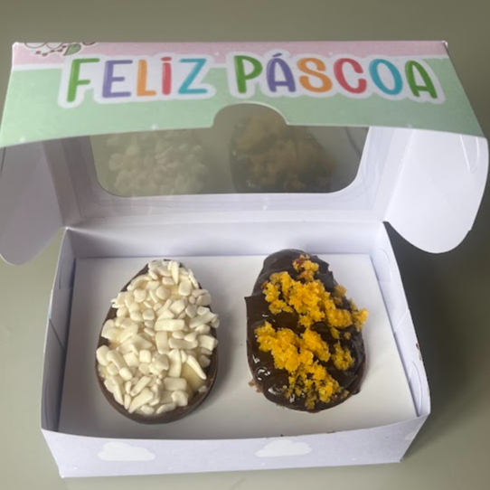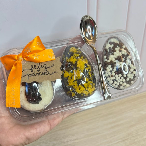 Uma experiencia única , três versões incríveis ! Ideal para quem ama provar novos sabores e não abre mão do capricho. Três mini ovos com 45 grs em média cada . Sabores , Bolo de Cenoura , Ninho com Nutella , Ele e Ela .