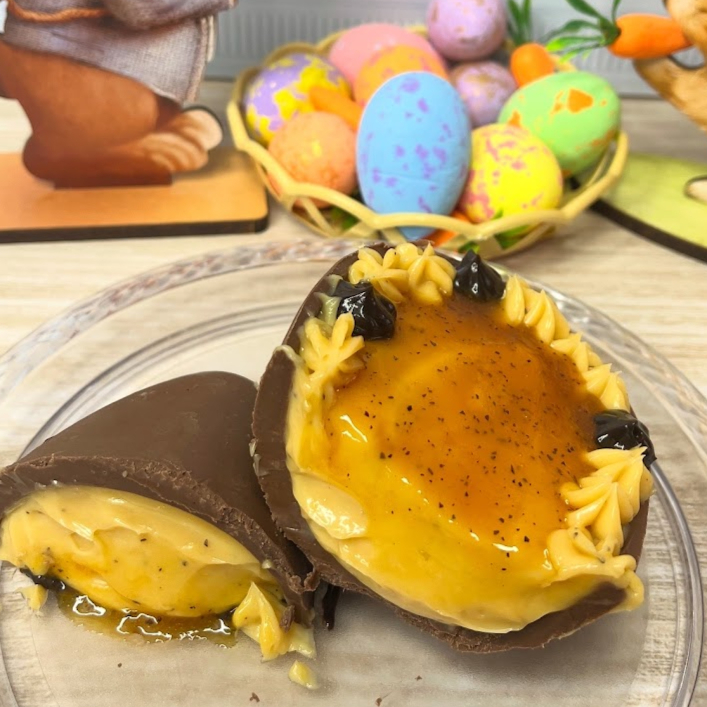 Recheado com aquele toque azedinho irresistível que só nosso brigadeiro de maracujá tem , feito com a redução da própria fruta , somente experimentando para saber. Enfim aquele doce equilibrado para deixar sua pascoa mais especial . Peso aprox. 140gr