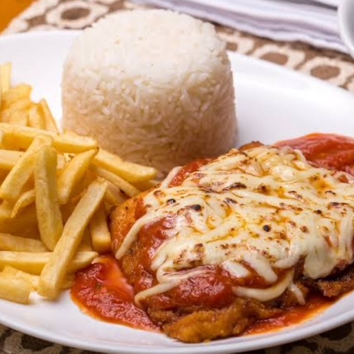ARROZ, FILE DE FRANGO EMPANADO, BATATA FRITA, MOLHO DE TOMATE E MUCARELA