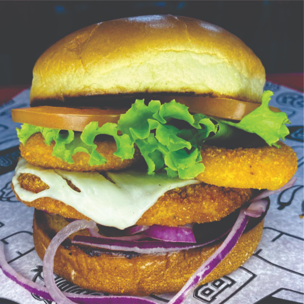 Pão de brioche, burguer de 120g de frango empanado, onion, muçarela, cebola roxa e salada