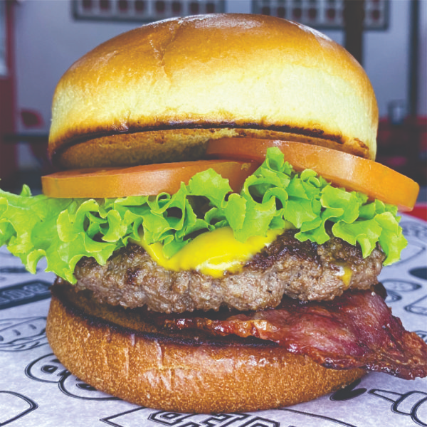 Pão de brioche ,120g de carne, cheddar, bacon, alface e tomate