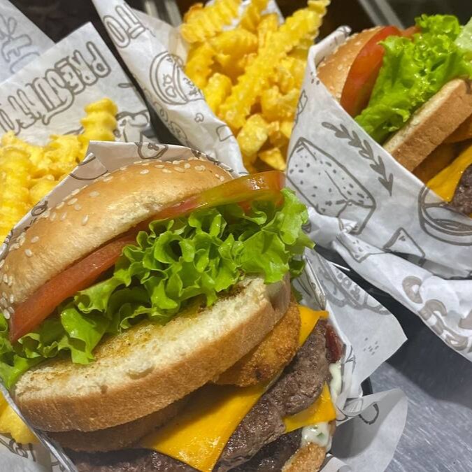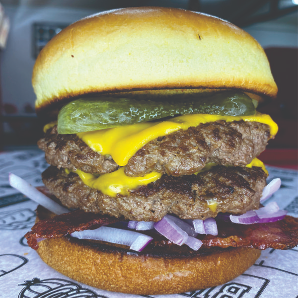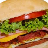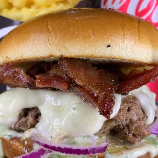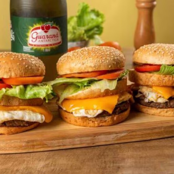 Pão, 03 bifes de hamburguer, bacon, cheddar, alface e tomate. entrega rapida feita pela 99food