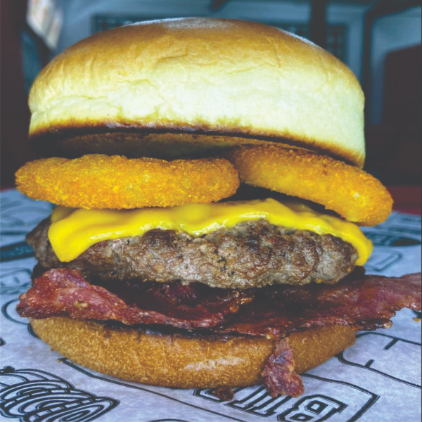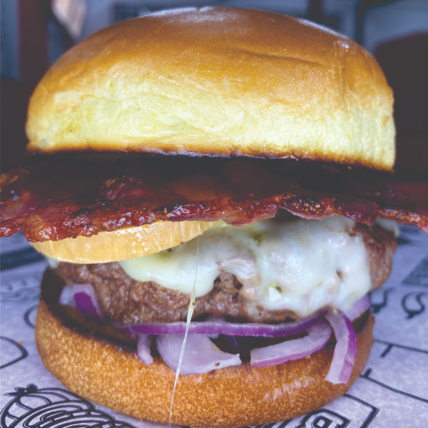 Pão de brioche ,carne 110g bacon,cebola roxa ,blend de queijo