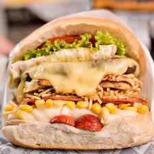 Pão, carne, bacon ,ovo ,presunto ,queijo frango desfiado milho, batata , abacaxi e salada