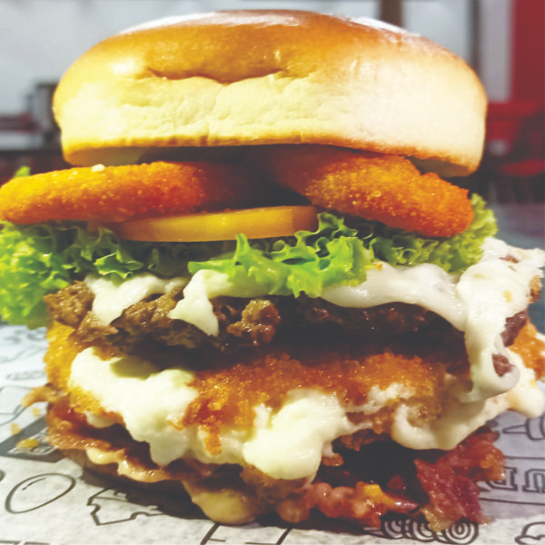 Pão de Brioche, 100g de puro Catupiry empanado, Blend de 120g de carne, bacon, muçarela e salada