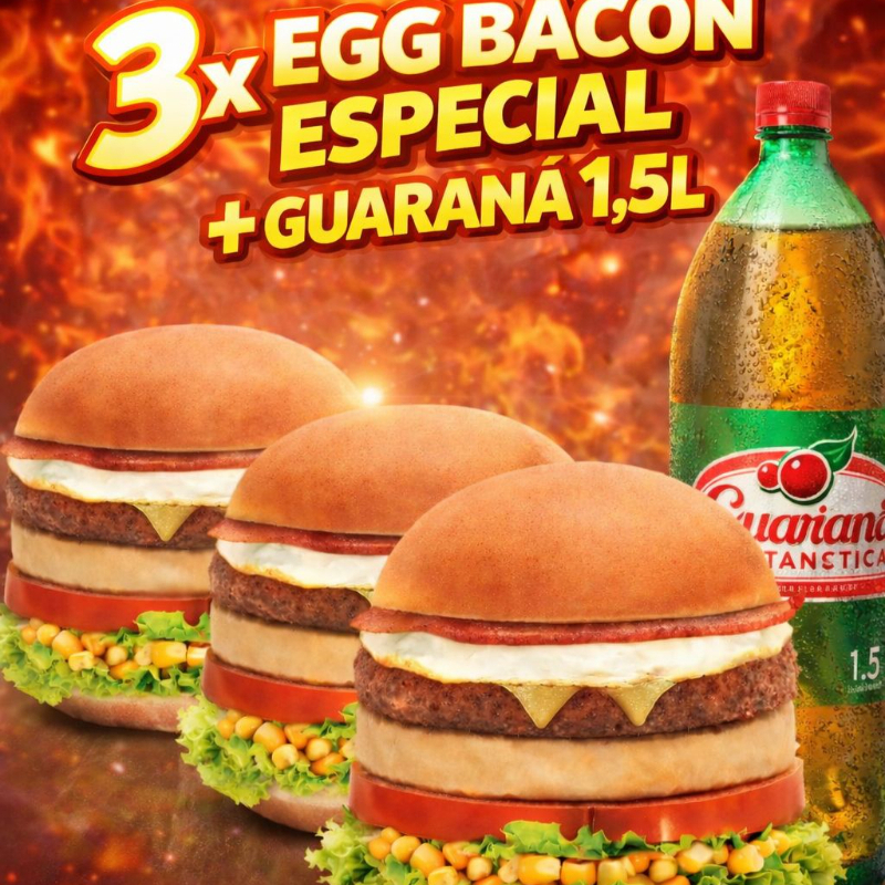 x egg bacon especial : Carne, bacon, ovo, queijo, milho, batata, alface e tomate( promoções não fazemos alterações e acréscimos) acompanha guarana 1,5L