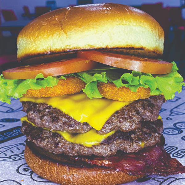 Pão de brioche ,duas carnes de 110g ,cheddar ,bacon ,onion e salada