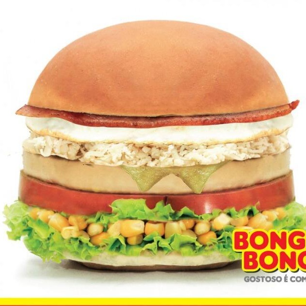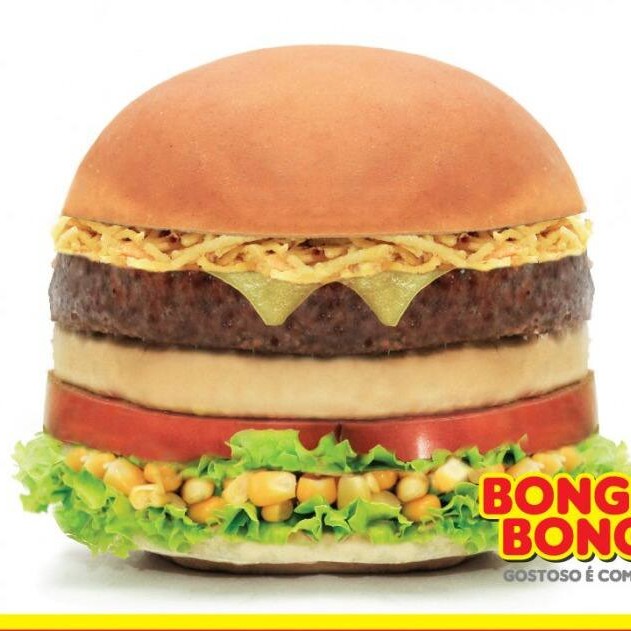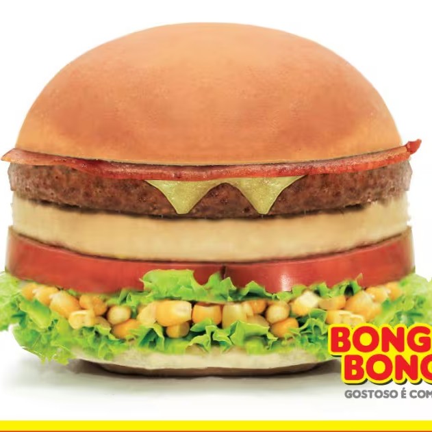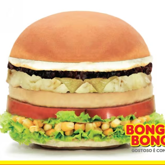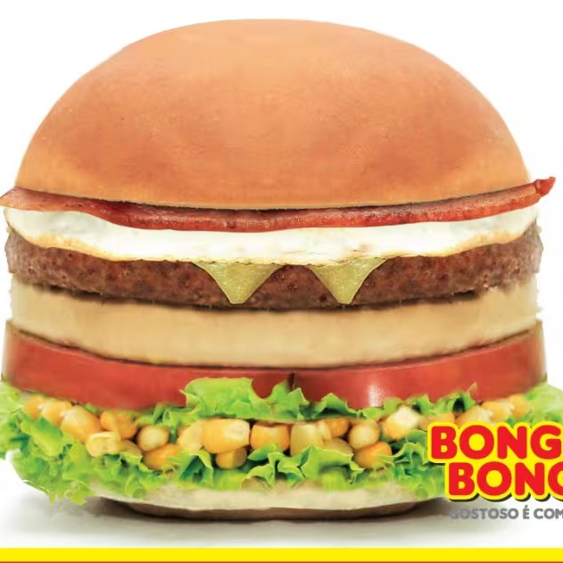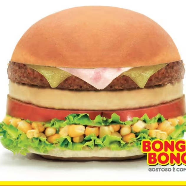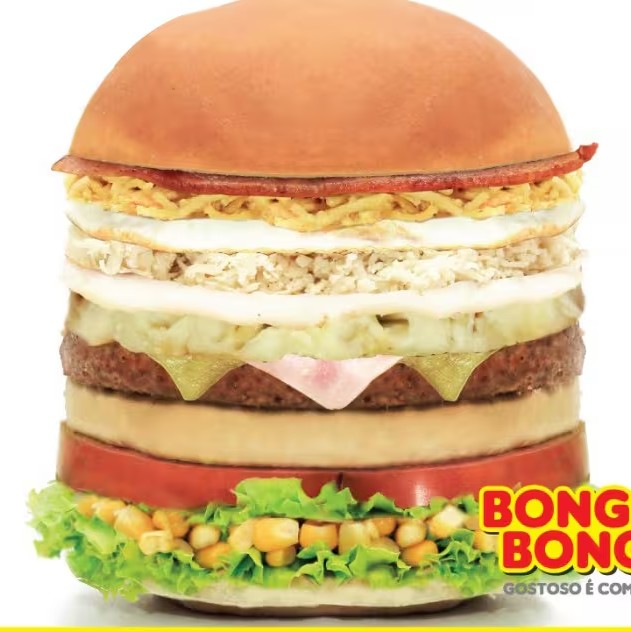 Pão, carne, bacon, ovo, queijo, milho, batata e salada