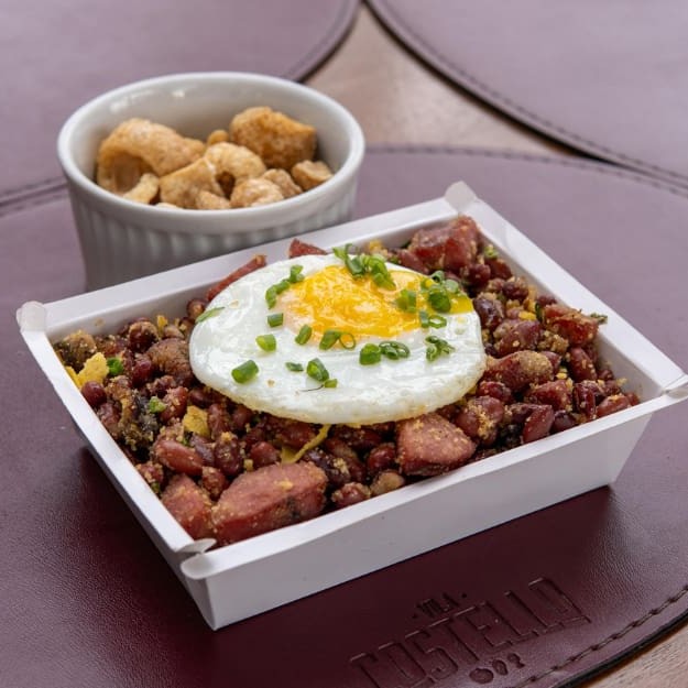 Feijão tropeiro mineiro preparado com feijão temperado, bacon crocante, linguiça saborosa, ovos mexidos e farinha de mandioca dourada. Servido com ovo frito de gema macia e torresmo crocante, trazendo o sabor autêntico e irresistível da comida caseira de Minas, Acompanha Ovo e Torresmo