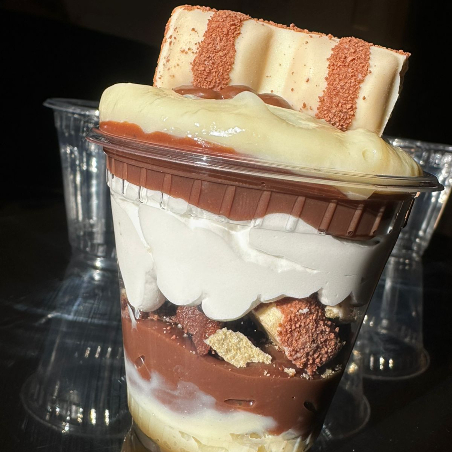 Deliciosas camadas de brigadeiro de ninho, brigadeiro 50% cacau, pedaços de brownie e kinder bueno, chantilly e nutella