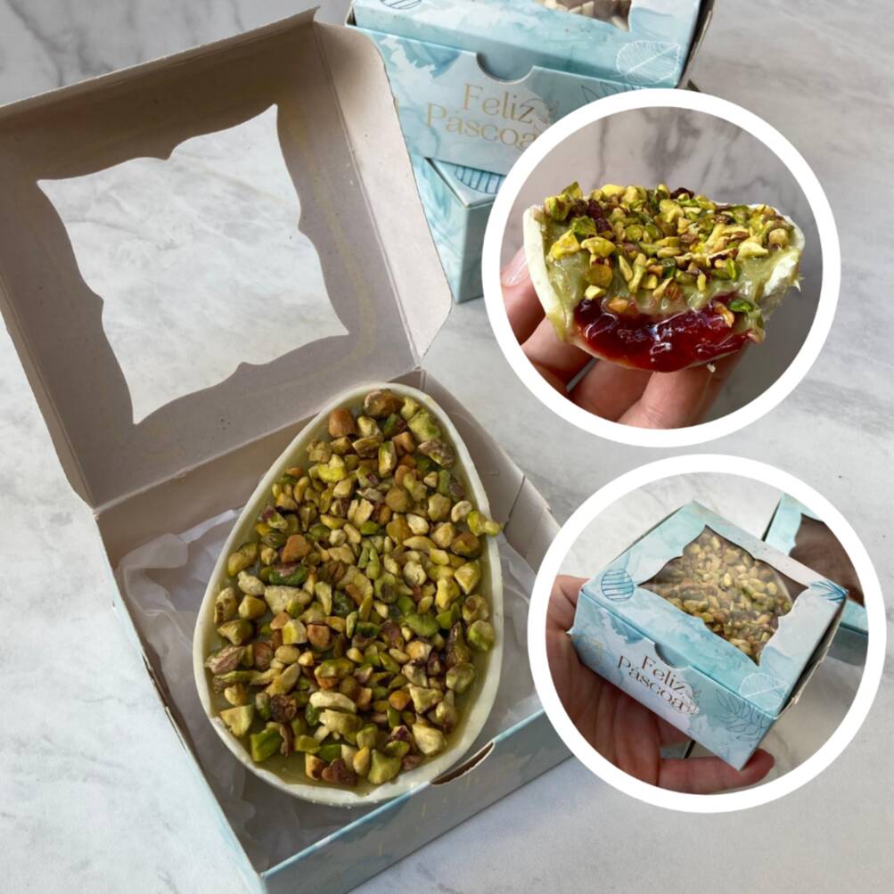 Meia banda de ovo de casca de chocolate branco recheada com brigadeiro de pistache e geleia de frutas vermelhas. Finalizado com pedacinhos de pistache. Uma explosão de sabores! Embalado em linda caixa presenteável (tamanho 10x10 cm, 150g).