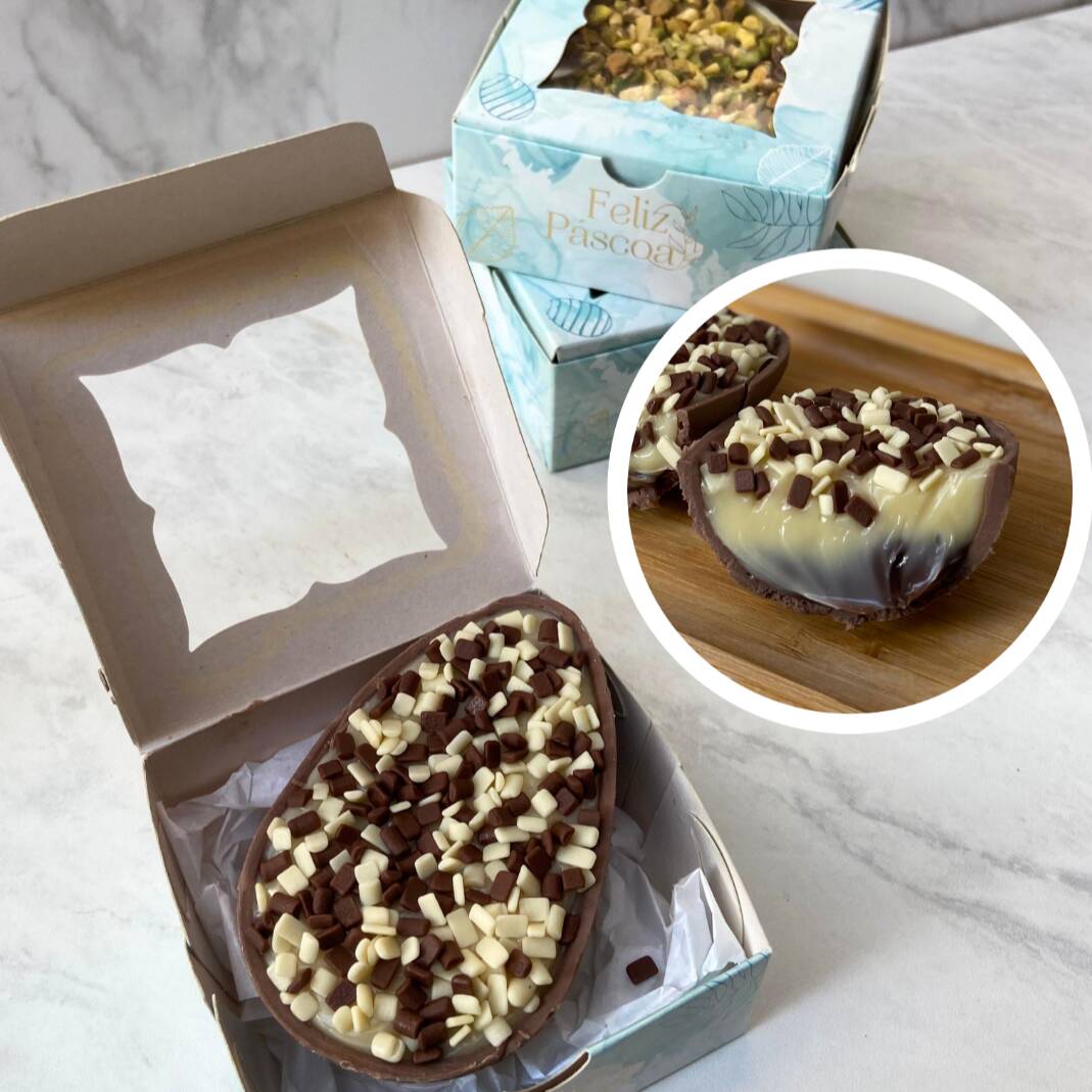 Meia banda de ovo de casca de chocolate ao leite recheada com brigadeiro branco e brigadeiro de chocolate. Finalizado com granulados de puro chocolate. Um ovo inspirado no nosso potinho de torta no pote best seller, o Duo! Embalado em linda caixa presenteável (tamanho 10x10 cm, 150g).